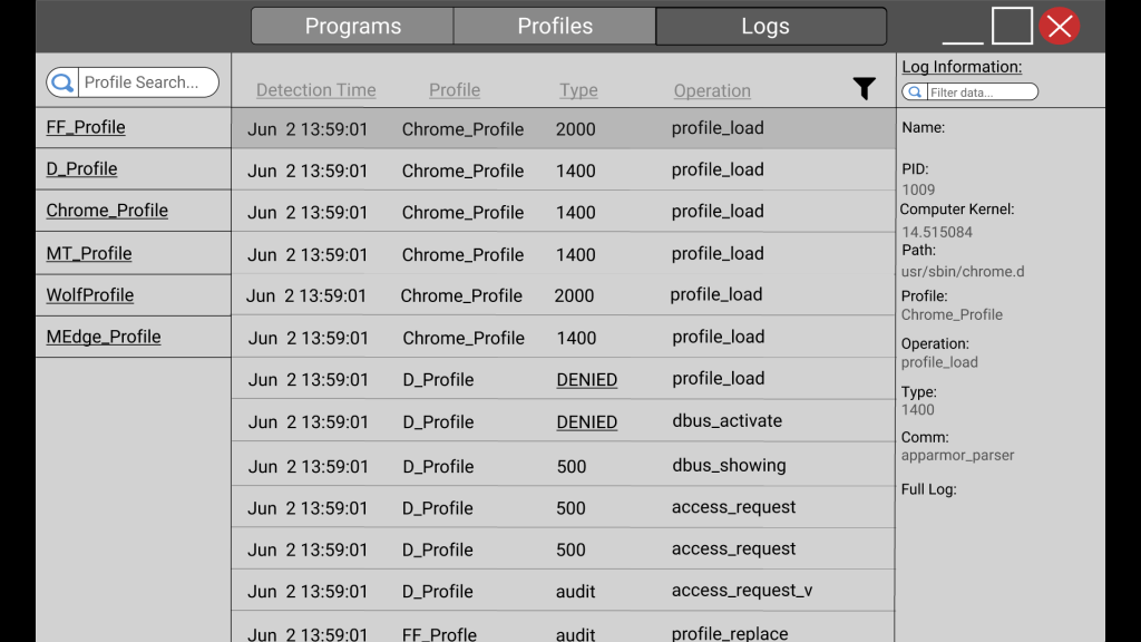 Image 2: The logs screen, displaying the logs of programs which have either been denied access thanks to app armor or tagged by their confinement.