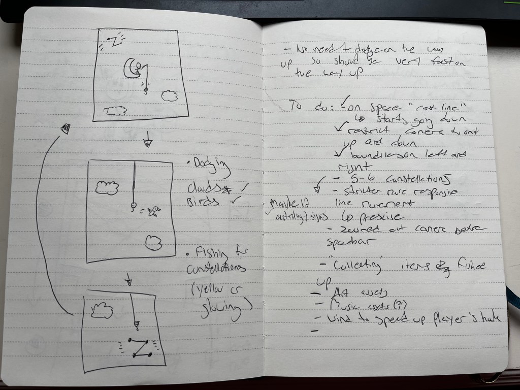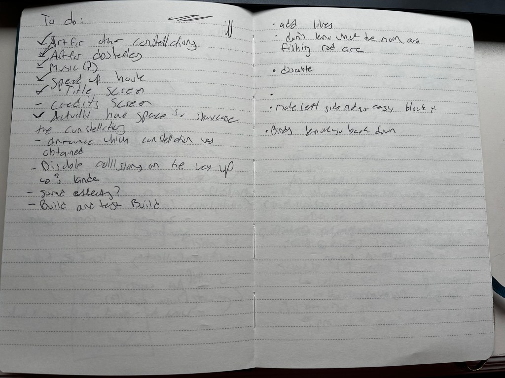 This was my first time using pixel art to create sprites for a game I worked on. Through determination and a lot of trial and error, I’m quite happy how the art turned out. I crafted 12 unique constellations, 2 obstacles, a player character, and their fishing hook all from scratch.